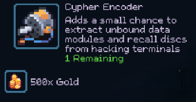 Cypher Encoder is an item purchasable at The Foundation Hub from the NPC Axon for 500 gold.